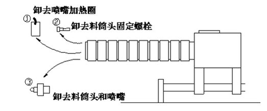 (此处料筒与与机器连接固定方式不一样,拆装方法就不一样,拆装时根据实际情况考虑)