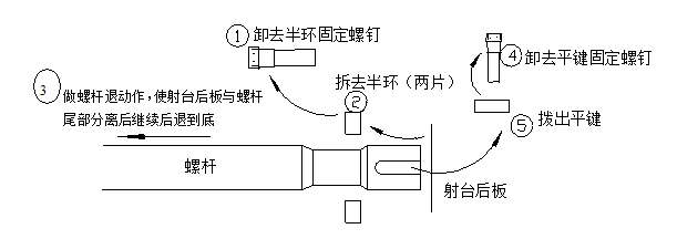 11、把螺杆向料筒前端移推出螺杆头用活动扳手扳住螺杆尾部,用专用扳手扳下螺杆头(注意:螺桿头为左旋螺纹.)